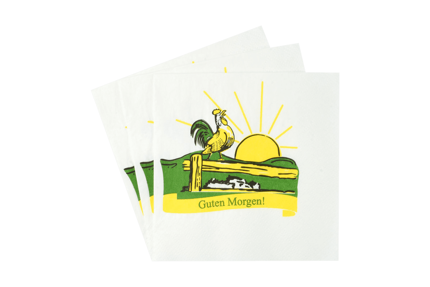 Die Motivservietten “Guten Morgen” in den Farben Weiß, Grün und Gelb sorgen schon beim Frühstück für gute Laune der Gäste in Ihrem Frühstücksraum. Diese Servietten haben die Größe von 24 x 24 cm, sind 2 lagig und bestehen aus reinem Zellstof.